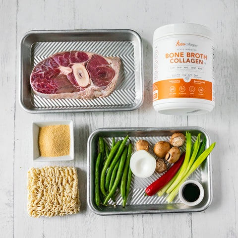 2. Remove shank. Add 2 heaping scoops of bone broth collagen and whisk. Turn on the saute feature. Add a handful of green beans and the package of ramen noodles (discard the flavor packet). Cook until the noodles are done.