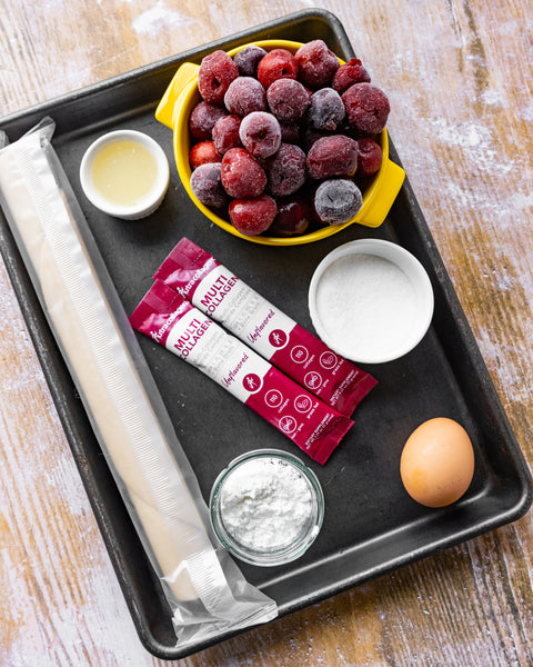 In a small bowl combine the cherries with the corn starch, collagen and lemon juice and sugar. (save a tbsp for dusting the crust)