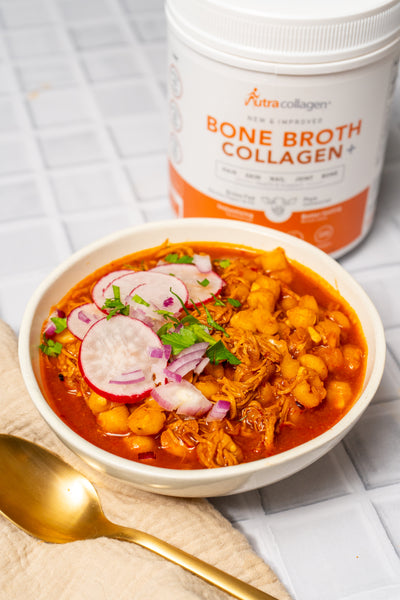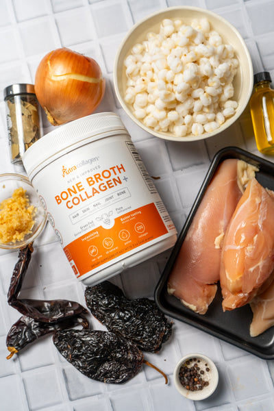 Shred the cooked chicken and return it to the pot. Add the chili sauce, hominy, and a few scoops of Bon Broth Collagen. Stir well.
