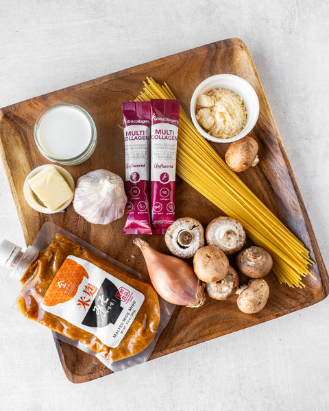 Sart by prepping the ingredients, you need to small dice the shallot, then slice the mushrooms and garlic. start cooking the noodles per package instructions. heat some butter in a wok or sauce pan and saute the onion until tender. add the mushrooms garlic and continue to saute. WHen the mushrooms are browned add the miso paste and cream. disolive a scoop collagen and add the noodles. toss in the parmesan and garnish with a few green onions and sesame seeds