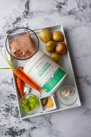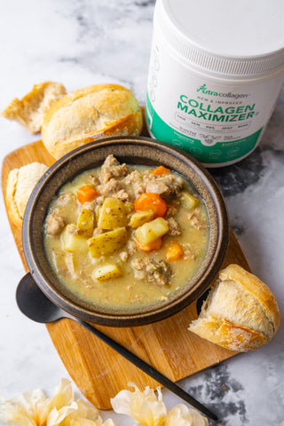 Start with an instant pot on sauté and drizzle a bit of oil in the pan. add in diced onion first and let them cook a few minutes. next pop in come diced celery. Whie those are cooking cut 3 or 4 carrots into 1/4 in disks and 5 or 6 potatoes into small bite size cubes. once the onions are tender add in the ground turkey, salt garlic powder and a bit of Italian seasoning. let that cook until the turkey is browned completely. try not to break up the meat too much. Add just enough water to cover the meat then put in the carrot and potato. cook on high pressure for 8 minutes and release the steam manually. add 3 scoops of the collagen then a flour slurry to thicken the sauce. salt and pepper to taste. enjoy with your favorite crusty bread to sop up all that delicious gravy.