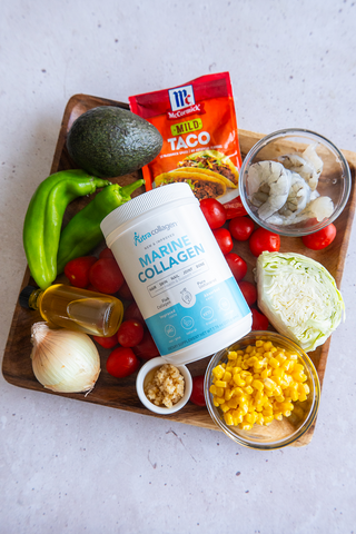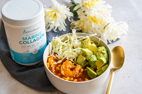 Add the shrimp and corn. Continue to simmer until the shrimp is just cooked then stir in the collagen and serve.